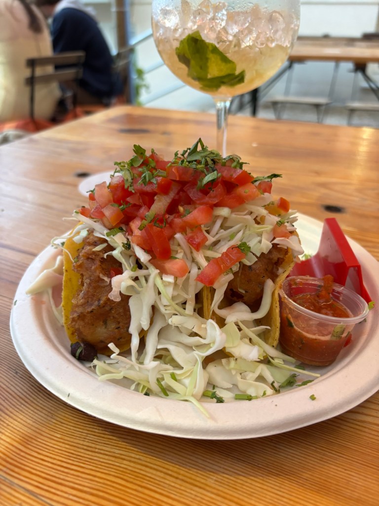 Being from Texas (21 years) and living in Arizona (15 years), I didn’t have tacos on my list of things to try in Portugal. (I’ve been burned by Euro-takes on tacos before.) Luckily, I didn’t keep my preconceived notions and went for the “baja fish tacos” (made with the local fish of the day) and “Portuguese mojito” (tho the Jesus Juice almost won out) at Tacos Pexito. This is a hole-in-the-wall without walls – tables are on wide platform steps looking out to sea. At sunset, trust me -chef’s kiss!