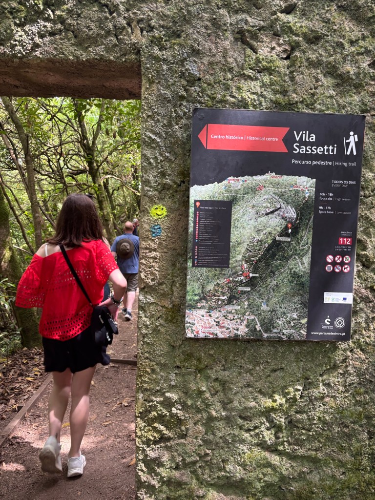 Hiking DOWN into town after Sintra (and/or after the Moorish Castle if you do that too while you’re on the mountain top) on the Vila Sassetti trail was awesome and didn’t take long… maybe 25 minutes from the parking lot trail head to the gate of the Vila grounds. Once you’re wandering Sasseti’s grounds, there’s a good bathroom stop and good views to take in, even benches to rest at, if you need it. From there, it is an easy (cobblestone) path of about 15-20 more minutes into the top of Sintra’s town.