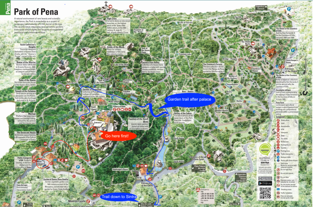 You could probably spend the majority of a day just in Pena’s park, wondering the trails, reading all the signs, admiring the trees, flowers and fountains, and exploring the cool buildings. We basically just did the “Lagos” and Queen Amelia’s garden trails plus a bit of wondering. Have their handy free interactive digital map on your phone. It tells you where you are versus where you think you are. See the map I marked up below for my suggested route to see lots of good stuff. We finished with Pena around noon with my plan, but you could spend longer for sure! If I spent the night here (which I would recommend doing if you can make it fit your plan, we would have but I couldn’t find accommodation for five people in just two rooms in Sintra).