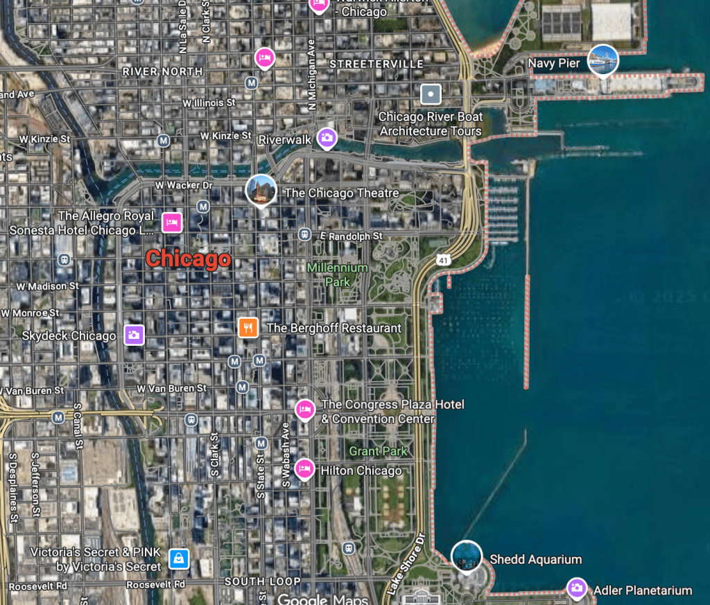 - Streeterville: On the east of Mag Mile is Streeterville. Busy during the weekday, but can feel like empty canyons on weekends. Most famous here: Navy Pier!