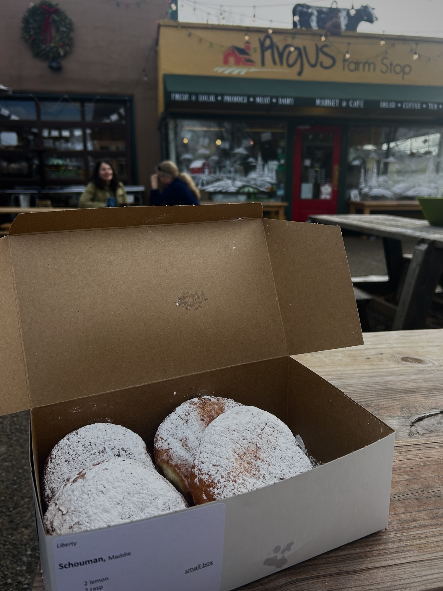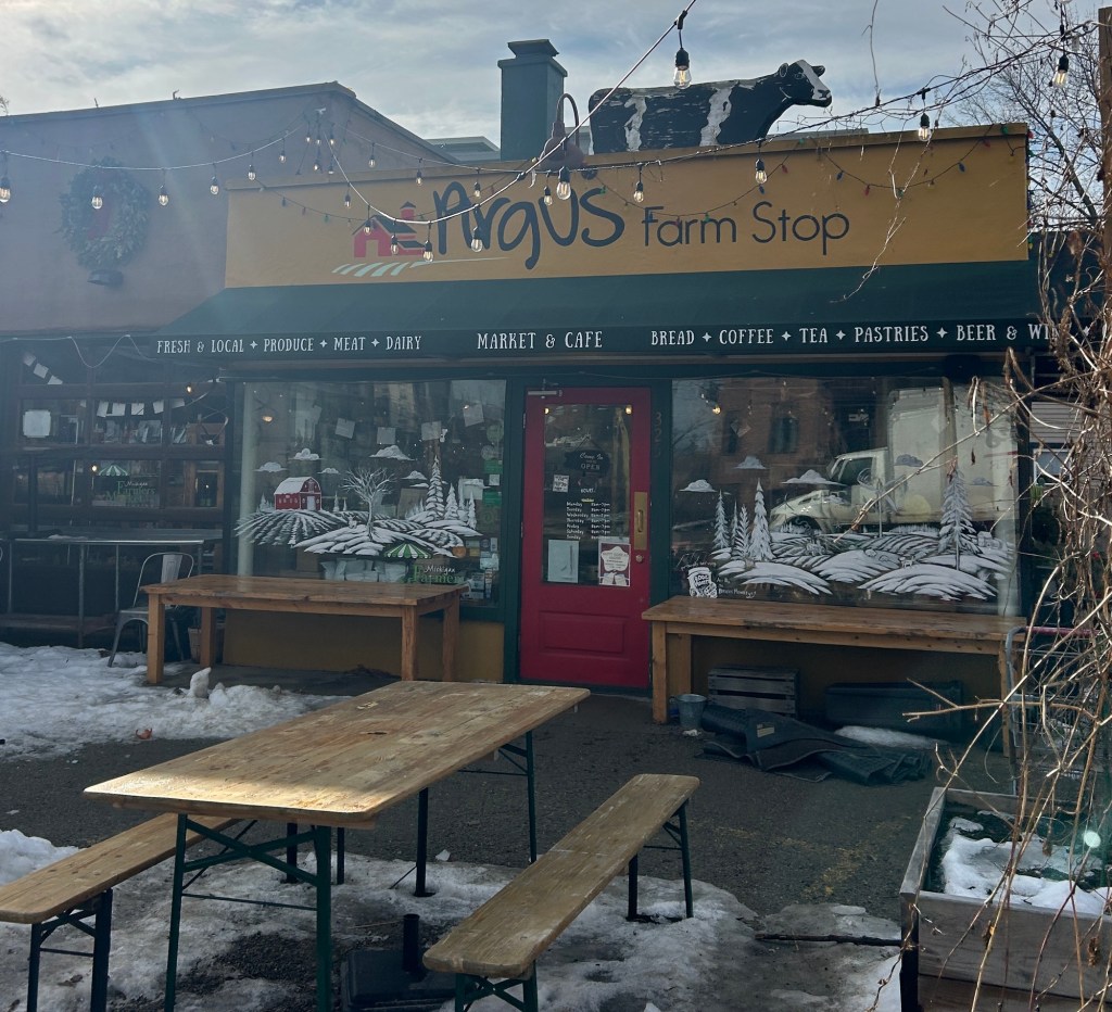 From the yellow painted walls that remind me of a wheat field, to the cow statue keeping guard, and the literal corn growing on the roof during the warmer months, Argus feels like a slice of farm life tucked into the hustle and bustle of downtown Ann Arbor. If the heaps of apples, butternut squash, root vegetables, and plentiful greens that line the shelves don’t convince you, the most lovely attached greenhouse turned lounge will. For me, it is the perfect place to enjoy a beverage and feel the comfort of summertime (even as the thermometer reminds me that it is still winter in Michigan).