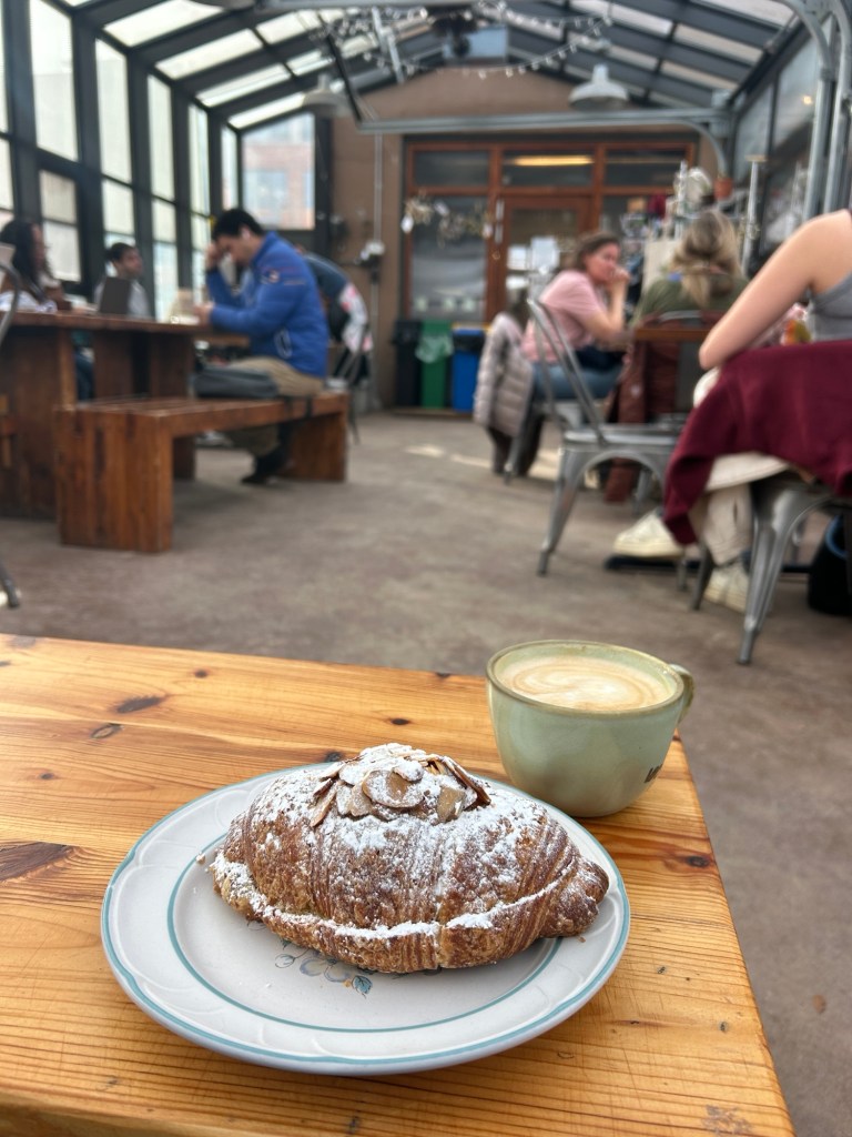After glancing at their specials menu, I ordered the “Hundred Acre Latte,” which was served piping hot in a sea glass-blue mug, plus an almond croissant dusted in powdered sugar. The latte was just the right amount of sweet, featuring a slight citrusy kick from the cardamom and the dreamy taste of steamed milk and honey (made by local bees). While not baked in house, the pastries are delivered fresh each morning from a selection of nearby bakeries. Besides coffee, they also have an assortment of wines and craft beer (yes, all brewed locally).