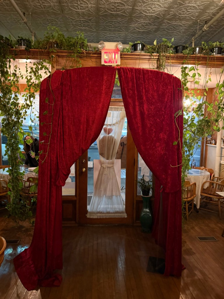 Inside a Victorian-era commercial building circa 1876 on E. Washington St., the entrance is fabricated in deep red, velvet curtains assembled into a vestibule. Step inside the door that creaks at you hello, peek your head through the curtains and wait to be seated.