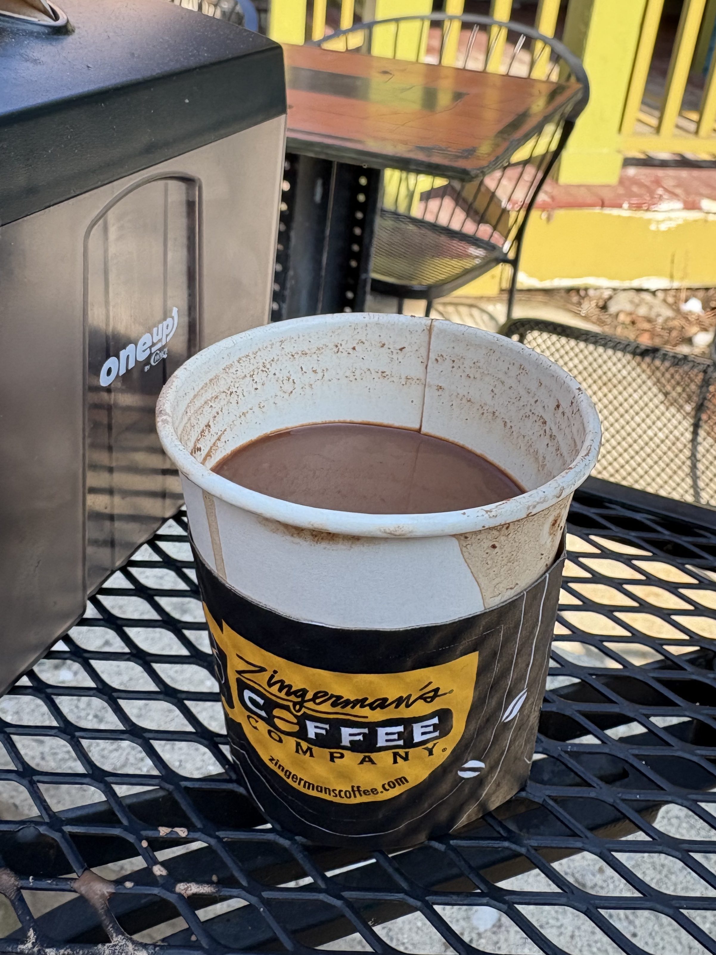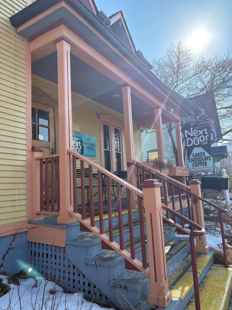 I’m sitting at a patio table sipping a spicy hot drink, and the smell of meat wafting from the side door of the deli is mixing with the cool winter air that’s pretending to be spring today. Two ladies behind me are discussing their life stories as families distribute different sandwiches to each other from the depths of their yellow to-go bags. Zingerman’s Next Door Café makes me feel like I can become a regular, as inevitable as the paintings of people eating chocolate that decorate the interior walls.