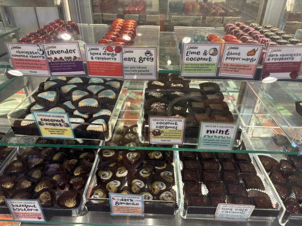 The ancient combination of spice and sweetness pours down my throat and warms me completely as sunlight dances across the brick exterior of the café. I’d certainly order it again, although the menu includes many other coffee and chocolate beverages to be discovered. There’s also an array of artfully designed truffles, as well as a freezer of sorbets that would be the perfect antidote for the heat of summertime.