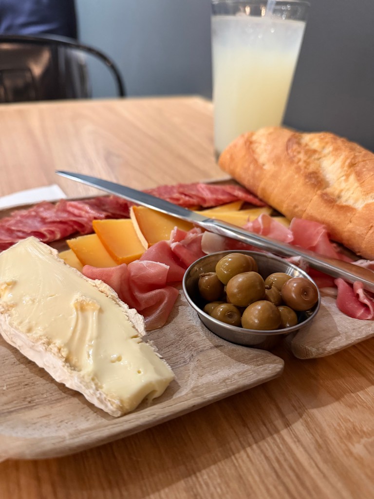 My board felt very decadent, much too rich for one person to finish it all. (Try as I might, I wasn’t quite able to.) But, I made a point to try each element of the board, the gouda cheese being the sharpest, most fragrant item. It was a lovely contrast to the lightness of the brie cheese, which I found was best used as a sudo-butter for the bread. The salami was a bright red and had a smoky taste, like the smells from the Ricewood BBQ counter had infiltrated it. It was the greasiest item on the board, but paired well with all parts of the dish. The prosciutto was smooth and thin, without any annoying stringy pieces that can sometimes make eating prosciutto feel like a chore. The Greek olives themselves were a bit out of my comfort zone, as they’re never my cup of tea. They were smaller than a penny and a muted green, and while they did add a nice tartness and switch up from the richness of the other parts of the board, they were more pit than olive. The lemonade took the place of the olives in terms of tartness for me, the perfect complimenting drink.