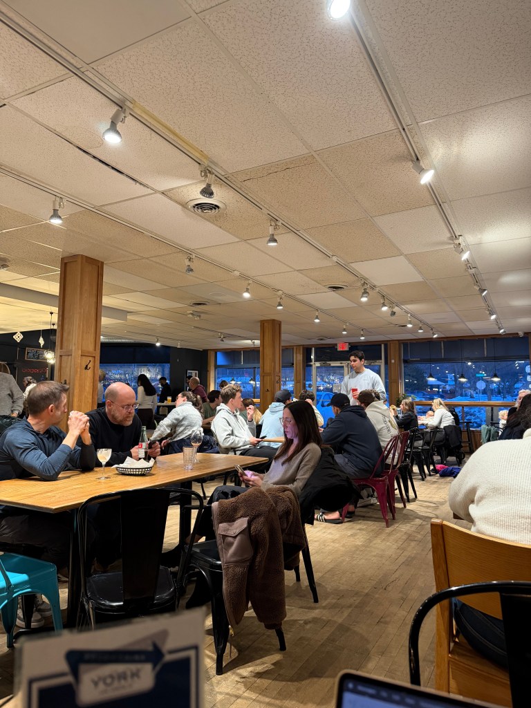 You can feel the care that was put into YORK. From the collection of handmade cheeses and meats behind the counter, to the art on the walls, and the tables full of local Ann Arbor residents, the entire restaurant was clearly made for the people. The tables were small but cozy, most of them a sturdy wood you could hunker down at. In the evening, the lighting was strong enough to illuminate the place but muted, with no glaring overhead that would cause a headache. The food menu includes deli favorites, sandwiches and bar snacks. The drinks menu includes coffees, wines and a full bar.