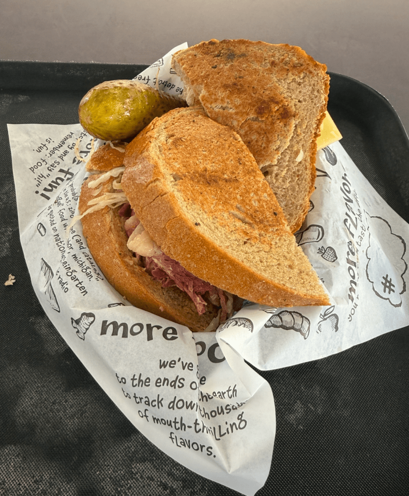 Handwritten menu boards crowd the walls, layered with descriptions that read more like short stories than sandwich labels. Shelves overflow with jams, olive oils, tins of fish, specialty mustards, and loaves of bread that look like they belong in a European market. There’s a line (there is always a line), and instead of feeling impatient, you feel like you’re part of a ritual. Standing there, reading sandwich after sandwich, overhearing debates about pastrami and corned beef, I realized the wait is part of the experience. This is Zingerman’s Delicatessen.