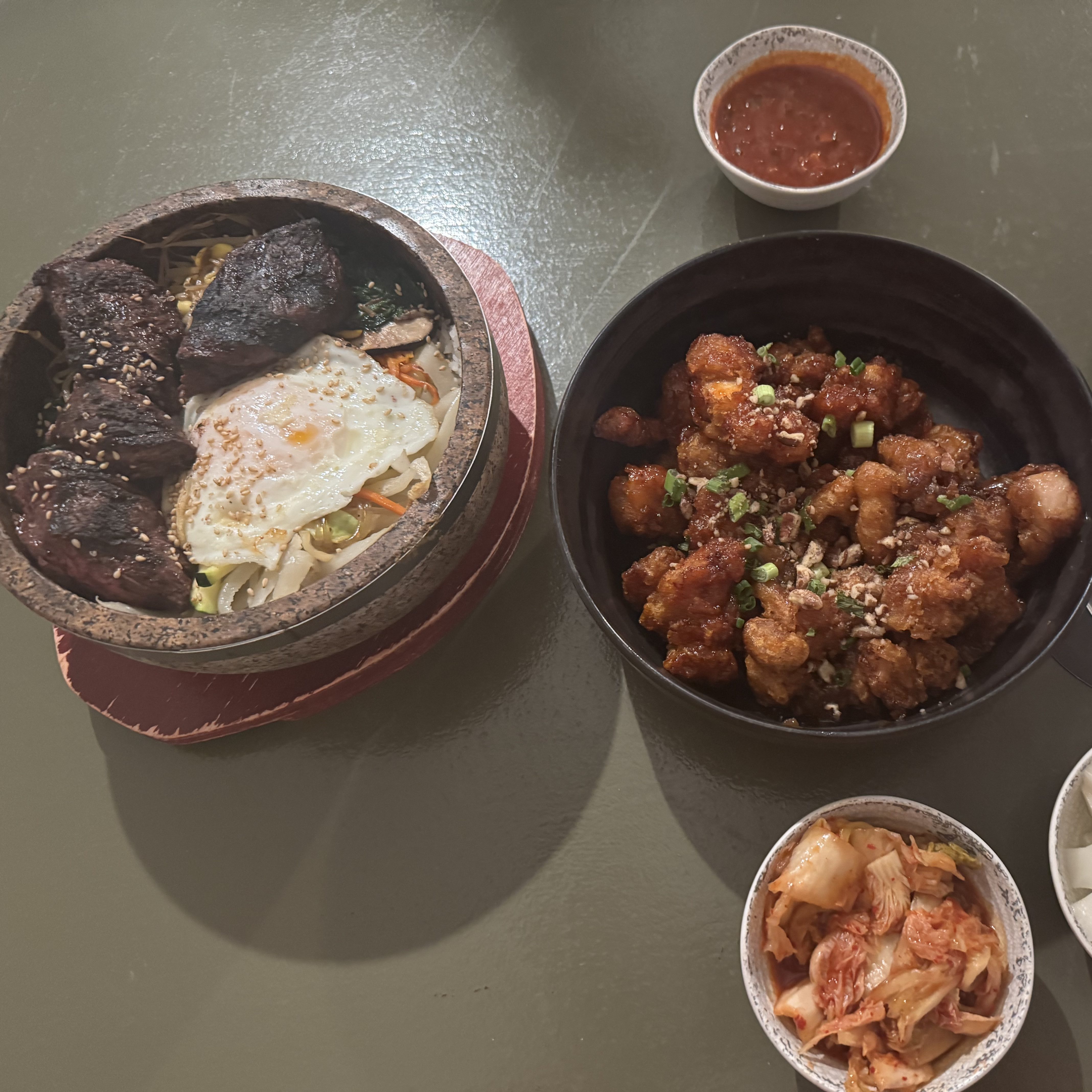 In addition to their signature dakgangjean, I also ordered steak dolslot bi-bimbap and a side of kimchi. The Korean fried chicken was one of the highlights of my meal. It had a perfectly crispy exterior with a tender and juicy interior, and the tangy flavor was incredibly satisfying. It’s safe to say that I did not need a to-go container for this. This dish truly reminded me of comfort food, it was warm and familiar.